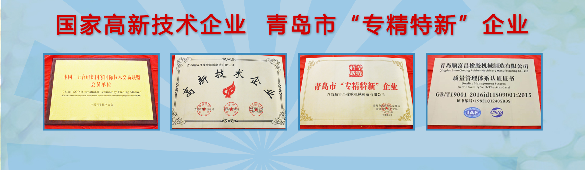 青島順富昌橡膠機(jī)械制造有限公司位于青島西海岸海洋高新區(qū),是國(guó)內(nèi)一家專(zhuān)業(yè)生產(chǎn)橡膠機(jī)械的國(guó)家級(jí)高新技術(shù)企業(yè)。公司榮獲青島市“專(zhuān)精特新”企業(yè)、國(guó)家級(jí)“高新技術(shù)”企業(yè)等榮譽(yù)稱(chēng)號(hào),注冊(cè)“順富昌”商標(biāo),并已通過(guò)ISO9001:2015質(zhì)量體系認(rèn)證、瑞士SGS認(rèn)證及歐盟CE出口認(rèn)證。公司產(chǎn)品使用三維軟件設(shè)計(jì),不僅暢銷(xiāo)全國(guó)各地,還遠(yuǎn)銷(xiāo)美國(guó)、英國(guó)、俄羅斯、荷蘭、泰國(guó)、馬來(lái)西亞、印尼、智利、墨西哥、烏克蘭、烏茲別克斯坦、法國(guó)等多個(gè)國(guó)家和地區(qū)。