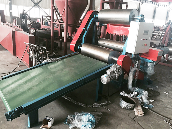 使用再生膠自動冷卻稱量下片機(jī)有機(jī)器自動切斷膠片,并且有輸送帶將膠片輸送出來,工人遠(yuǎn)離機(jī)器,提高安全系數(shù)。